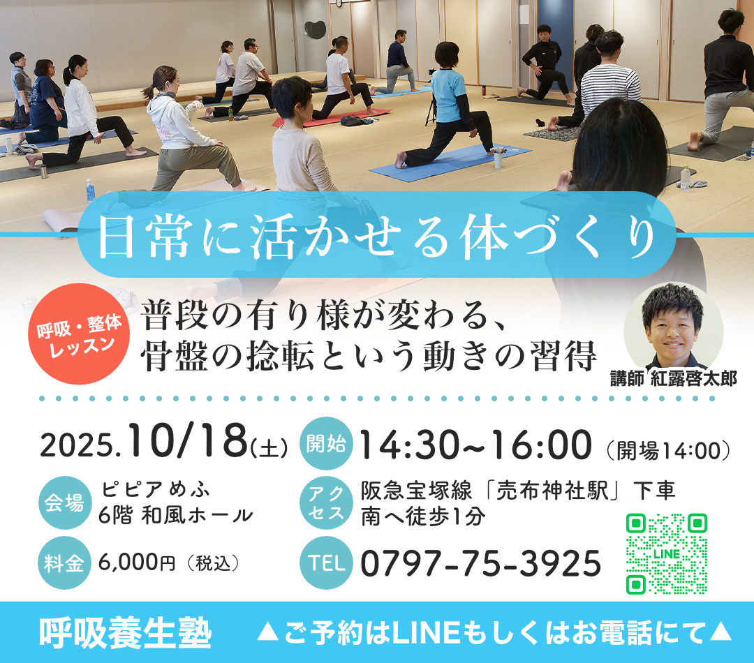 今月は“骨盤を整える”というよく聞くものの、一般の方にとって具体的にどうしたら整うのかわからない部分を、“骨盤の捻転”という動きの回復を通して、明確に体感いただくことがテーマとなります。