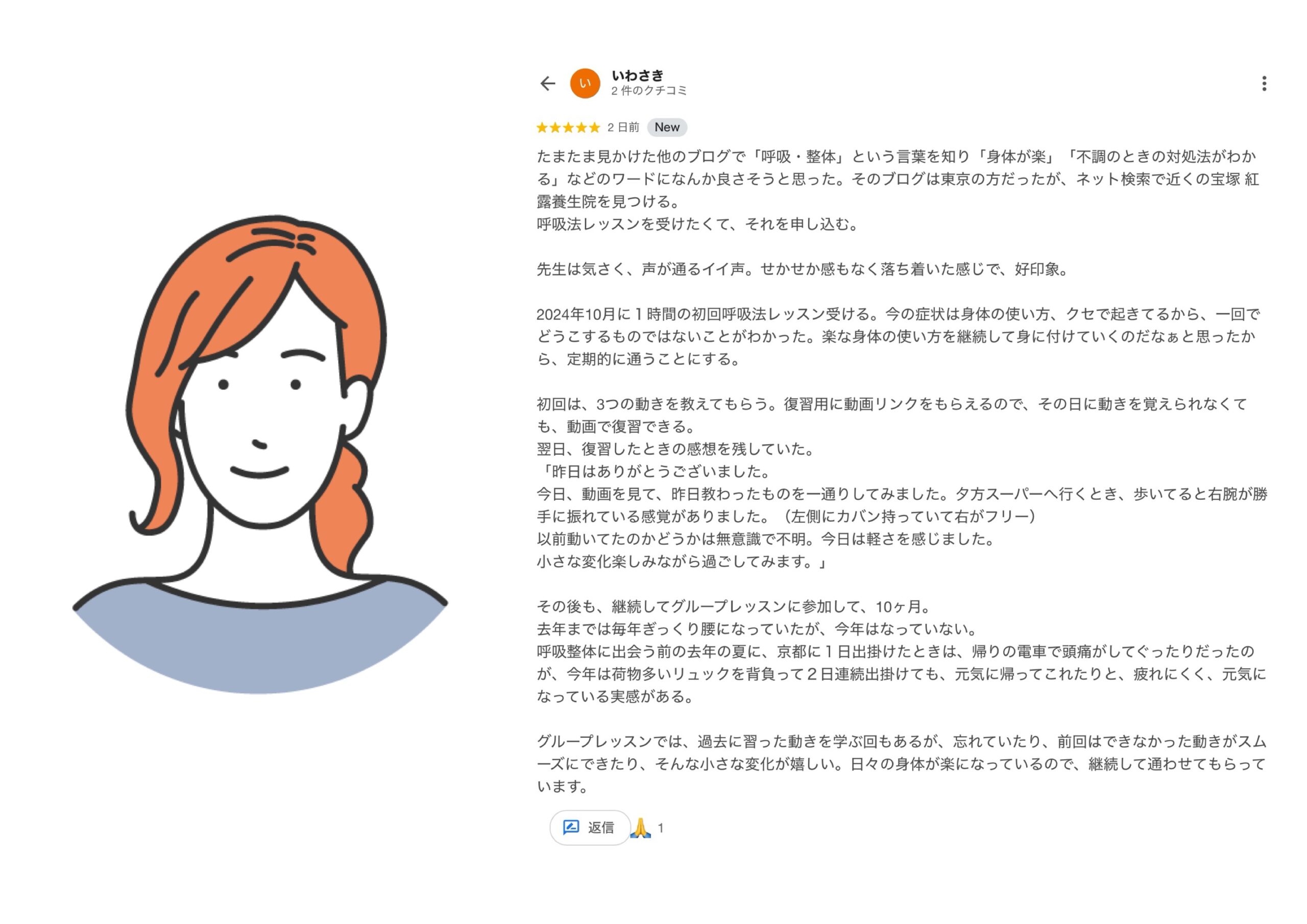 2024年10月に1時間の初回呼吸法レッスン受ける。今の症状は身体の使い方、クセで起きてるから、一回でどうこするものではないことがわかった。楽な身体の使い方を継続して身に付けていくのだなぁと思ったから、定期的に通うことにする。